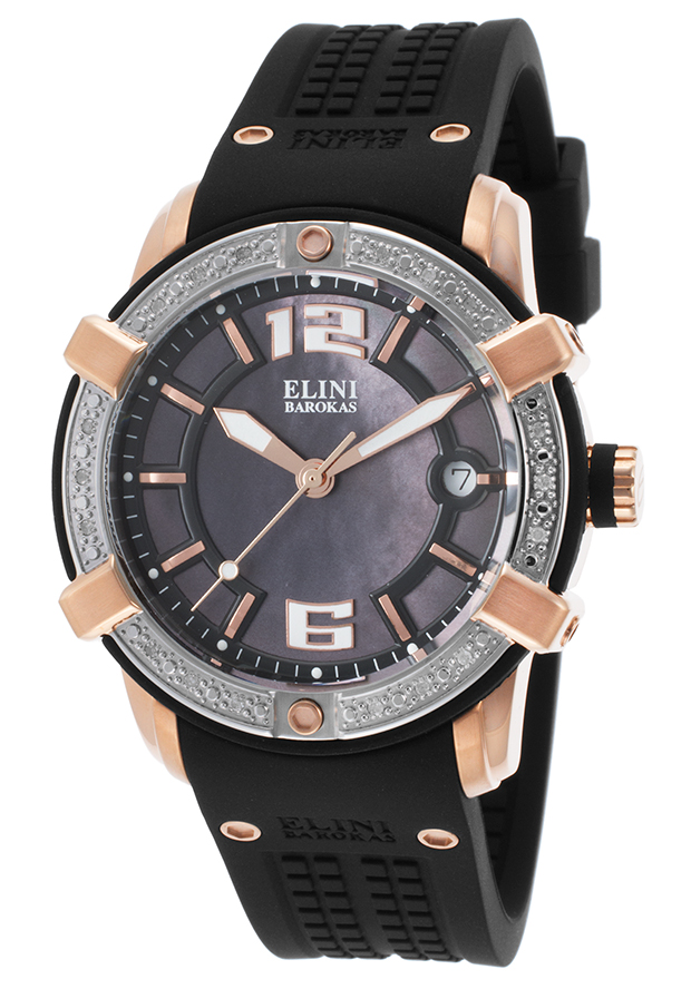 Rose gold ion-plated stainless steel case with a black silicone strap. Fixed stainless steel bezel with a black silicone rim and set with crystals. Black mother of pearl dial with luminous rose gold-tone hands and index hour markers. Arabic numerals mark the 6 and 12 o'clock positions. Minute markers around the outer rim. Dial Type: Analog. Luminescent hands and markers. Date display at the 3 o'clock position. ISA caliber 2331/00103/6000 quartz movement. Scratch resistant Sapphitek crystal. Pull / push crown. Screw down case back. Case size: 39 mm. Case thickness: 12 mm. Round case shape. Band width: 18 mm. Band length: 8 inches. Deployment clasp with a push button release. Water resistant at 100 meters / 330 feet. Functions: date, hour, minute, second. Sport watch style. Watch label: Swiss Movt. Elini Barokas Spirit Ladies Watch ELINI-20005D-RG-01-SB.