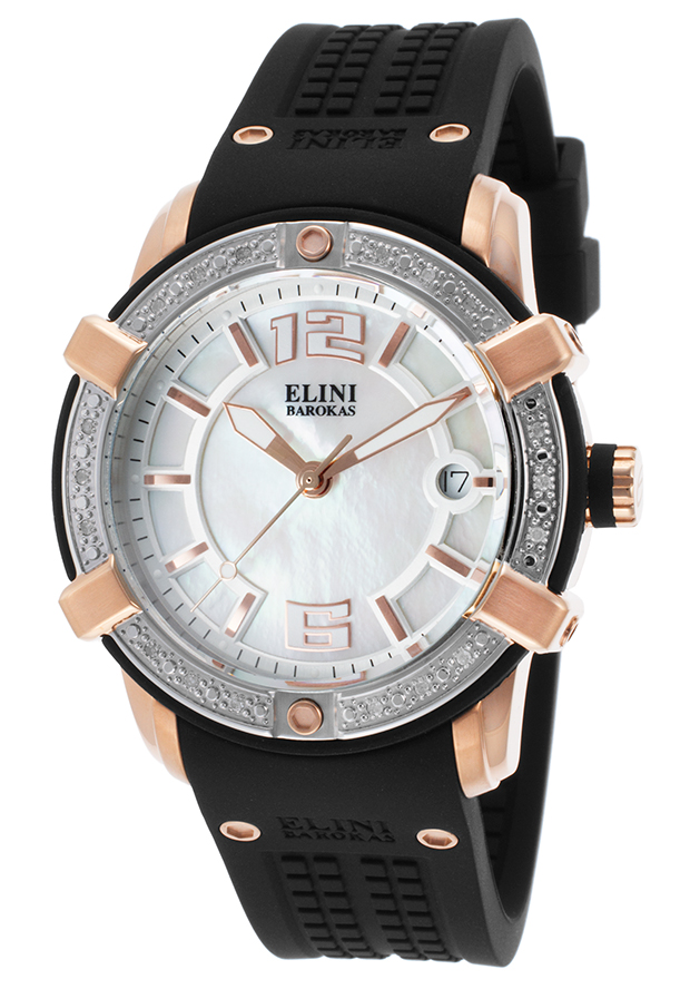 Rose gold ion-plated stainless steel case with a black silicone strap. Fixed stainless steel bezel with a black silicone rim and set with crystals. Mother of pearl dial with luminous rose gold-tone hands and index hour markers. Arabic numerals mark the 6 and 12 o'clock positions. Minute markers around the outer rim. Dial Type: Analog. Luminescent hands and markers. Date display at the 3 o'clock position. ISA caliber 2331/00103/6000 quartz movement. Scratch resistant Sapphitek crystal. Pull / push crown. Screw down case back. Case size: 39 mm. Case thickness: 12 mm. Round case shape. Band width: 18 mm. Band length: 8 inches. Deployment clasp with a push button release. Water resistant at 100 meters / 330 feet. Functions: date, hour, minute, second. Sport watch style. Watch label: Swiss Movt. Elini Barokas Spirit Ladies Watch ELINI-20005D-RG-02-SB