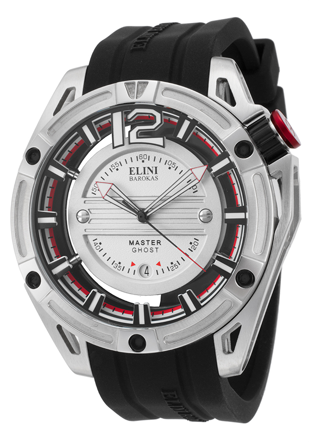 Stainless steel case with a black silicone strap. Fixed stainless steel bezel. Silver translucent dial with luminous silver-tone hands and index hour markers. An Arabic numeral appears at the 12 o'clock position. Minute markers around the outer rim. Dial Type: Analog. Luminescent hands and markers. Date display at the 6 o'clock position. ISA caliber 8371/2010/6004 quartz movement. Scratch resistant Sapphitek crystal. Screw down crown. Screw down case back. Case size: 52 mm. Case thickness: 15 mm. Round case shape. Band width: 24 mm. Band length: 8.5 inches. Tang clasp. Water resistant at 200 meters / 660 feet. Functions: chronograph, date, hour, minute, second. Sport watch style. Watch label: Swiss Movt. Elini Barokas Master Ghost Mens Watch ELINI-20016-02S.