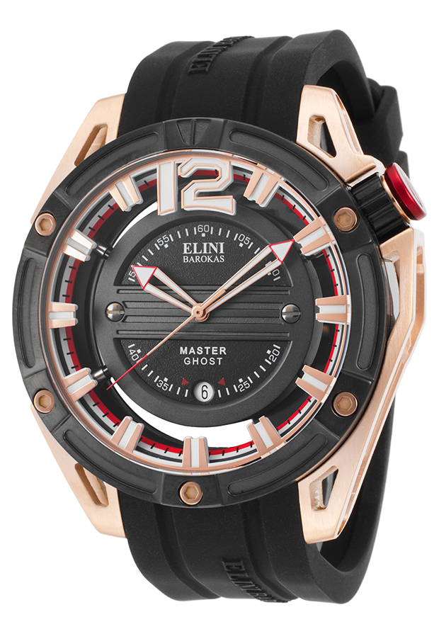 Rose gold ion-plated stainless steel case with a black silicone strap. Fixed black ion-plated bezel. Black translucent dial with luminous rose gold-tone hands and index hour markers. An Arabic numeral appears at the 12 o'clock position. Minute markers around the outer rim. Dial Type: Analog. Luminescent hands and markers. Date display at the 6 o'clock position. ISA caliber 2331/00103/6008 quartz movement. Scratch resistant Sapphitek crystal. Pull / push crown. Screw down case back. Case size: 48 mm. Case thickness: 15 mm. Round case shape. Band width: 19 mm. Band length: 9 inches. Tang clasp. Water resistant at 100 meters / 330 feet. Functions: date, hour, minute, second. Sport watch style. Watch label: Swiss Movt. Elini Barokas Master Ghost Mens Watch ELINI-20016-RG-01-BB.