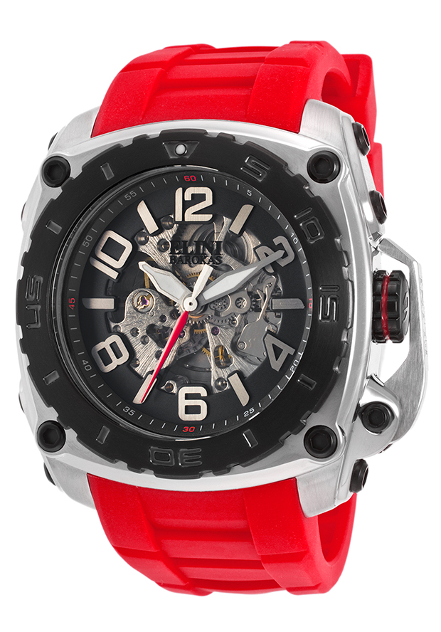 Stainless steel case with a red silicone strap. Unidirectional black ion-plated bezel. Black (silver skeleton) dial with luminous silver-tone hands and Arabic numeral and index hour markers. Minute markers around the outer rim. Dial Type: Analog. Luminescent hands. Caliber PTS-2650 automatic movement. Scratch resistant Sapphitek crystal. Screw down crown with a protective bar. Transparent screw down case back. Case size: 48 mm. Case thickness: 17 mm. Cushion case shape. Band width: 24 mm. Band length: 8.5 inches. Tang clasp. Water resistant at 200 meters / 660 feet. Functions: hour, minute, second. Sport watch style. Watch label: China Movt. Elini Barokas The General Prime Automatic Mens Watch ELINI-20027-01-BB-RDS.