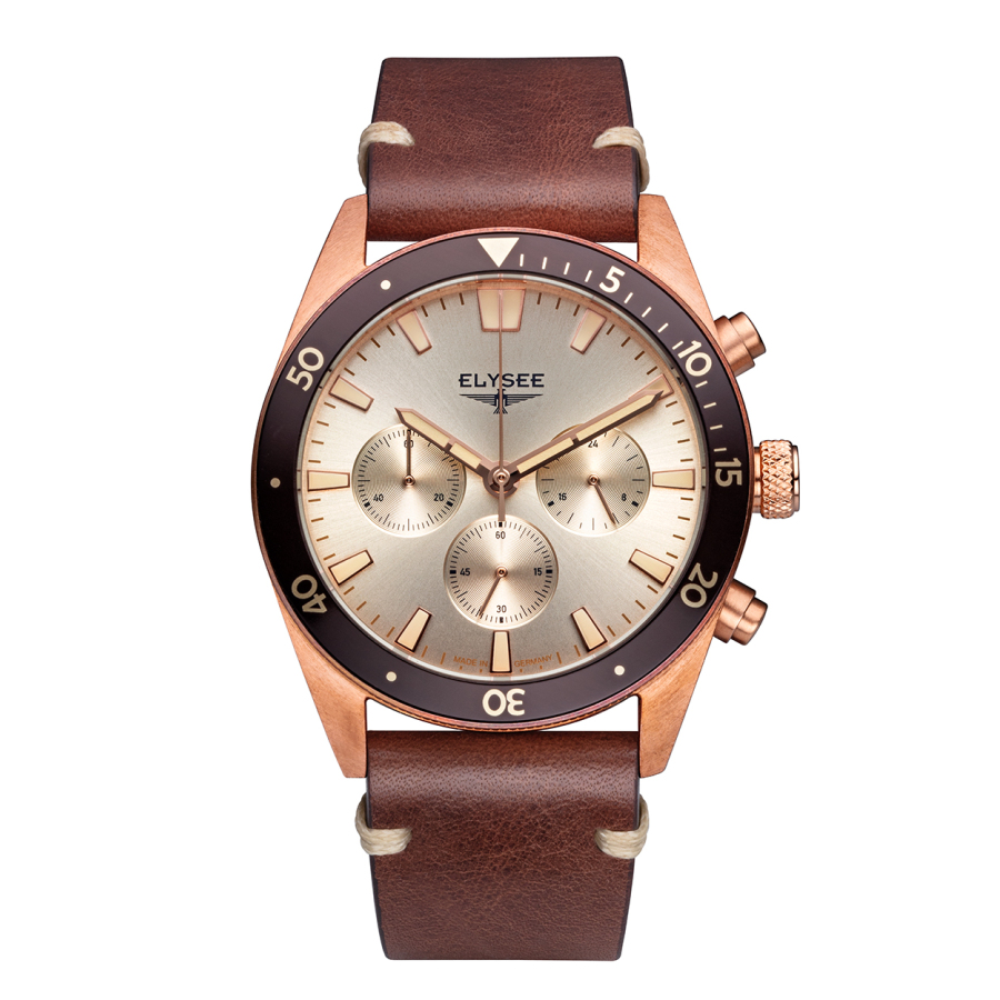 Rose gold-tone bronze case with a brown leather strap. Uni-directional rotating brown bezel. Champagne dial with rose gold-tone hands and index hour markers. Minute markers around the outer rim. Dial Type: Analog. Luminescent hands and markers. Chronograph - three sub-dials displaying: 60 minutes, 60 seconds, 24 hours. Seiko VK63 quartz movement. Scratch resistant sapphire crystal. Pull / push crown. Solid case back. Round case shape, case size: 41 mm, case thickness: 12 mm. Band width: 22 mm. Buckle clasp. Water resistant at 100 meters / 330 feet. Functions: chronograph, hour, minute, second. Dress watch style. Elysee Bronze Chrono Chronograph Quartz Champagne Dial Mens Watch 98015.
