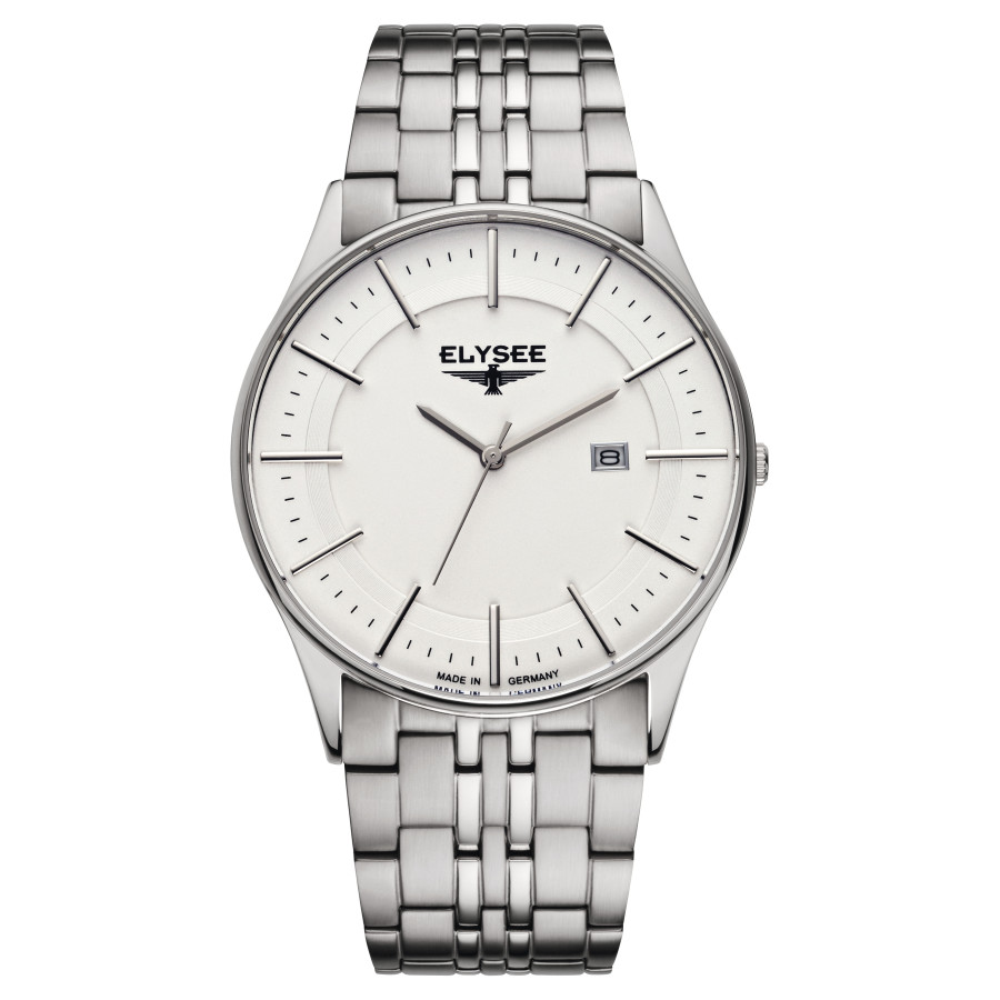 Silver-tone stainless steel case with a silver-tone stainless steel bracelet. Fixed silver-tone stainless steel bezel. White dial with silver-tone hands and index hour markers. Minute markers around the outer rim. Dial Type: Analog. Date display at the 3 o'clock position. Citizen/Miyota 9U13 quartz movement. Scratch resistant sapphire crystal. Pull / push crown. Solid case back. Round case shape, case size: 42 mm, case thickness: 7 mm. Band width: 24 mm. Fold over clasp. Water resistant at 50 meters / 165 feet. Functions: date, hour, minute, second. Dress watch style. Watch label: Japan Movt. Elysee Diomedes II Quartz White Dial Mens Watch 83015.