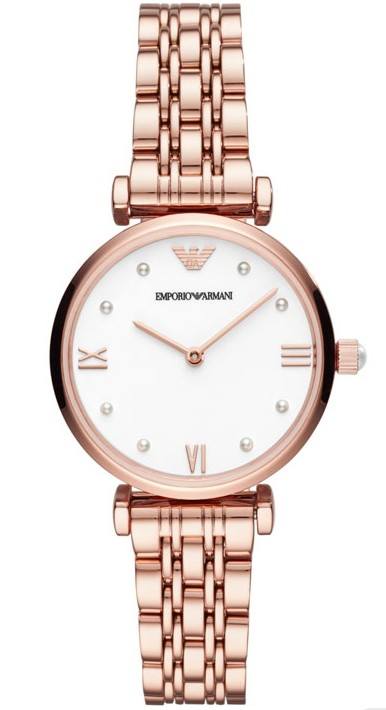 Rose gold-tone stainless steel case and bracelet. Fixed rose gold-tone bezel. White dial with rose gold-tone hands and dot hour markers. Roman numerals appear at the 3, 6 and 9 o'clock positions. The Emporio Armani Eagle appears at the 12 o'clock position. Dial Type: Analog. Quartz movement. Scratch resistant mineral crystal. Pull / push crown. Solid case back. Round case shape. Case size: 32 mm. Case thickness: 8 mm. Band width: 14 mm. Fold over clasp with a push button release. Water resistant at 30 meters / 100 feet. Functions: hour, minute. Gianni T-bar Series. Casual watch style. Emporio Armani Gianni T-Bar Quartz White Dial Ladies Watch AR11267.