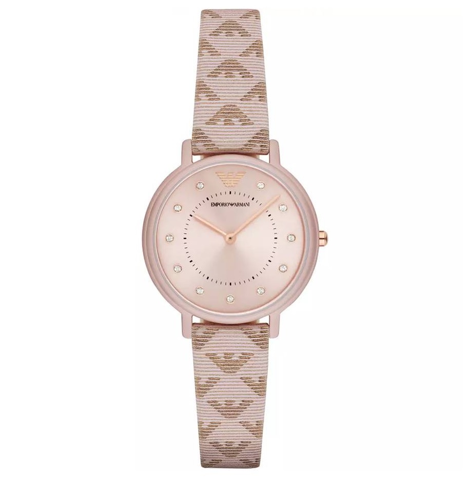 Rose gold-tone stainless steel case with a rose gold leather strap. Fixed rose gold-tone bezel. Rose dial with rose gold-tone hands and crystal hour markers. Minute markers. The Emporio Armani Eagle appears at the 12 o'clock position. Dial Type: Analog. Quartz movement. Scratch resistant mineral crystal. Pull / push crown. Solid case back. Round case shape. Case size: 32 mm. Tang clasp. Water resistant at 30 meters / 100 feet. Functions: hour, minute. Kappa Series. Dress watch style. Watch label: Japan Movt. Emporio Armani Kappa Quartz Crystal Rose Dial Ladies Watch 2597261.