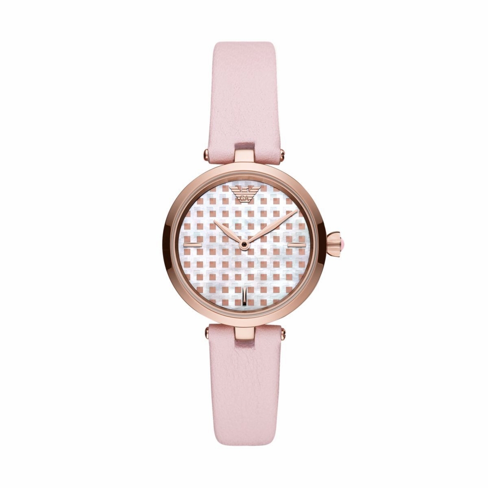 Rose gold-tone stainless steel case with a pink leather strap. Fixed rose gold-tone bezel. Mother of pearl dial with rose gold-tone hands. Index markers at the 3, 6 and 9 o'clock positions. The Emporio Armani Eagle appears at the 12 o'clock position. Dial Type: Analog. Quartz movement. Scratch resistant mineral crystal. Pull / push crown. Solid case back. Round case shape. Case size: 32 mm. Case thickness: 8 mm. Band width: 14 mm. Tang clasp. Water resistant at 30 meters / 100 feet. Functions: hour, minute. Casual watch style. Emporio Armani Quartz Mother of Pear Dial Ladies Watch AR11313.