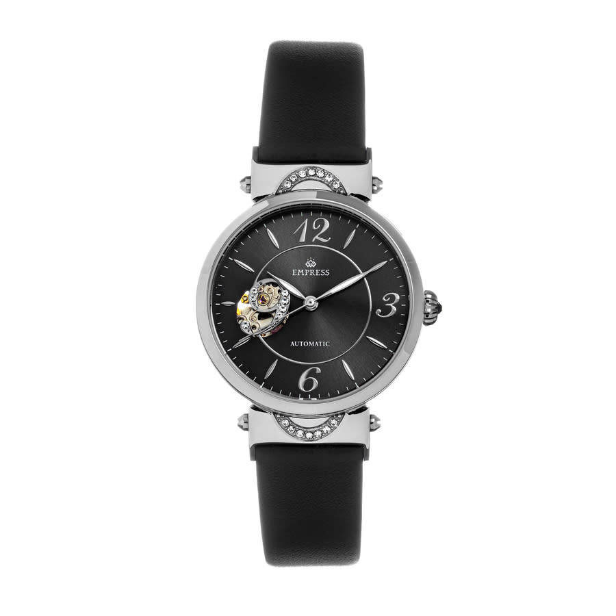 Silver-tone stainless steel case with a black genuine leather strap. Fixed silver-tone stainless steel bezel. Black dial with silver-tone leaf-style shape hands and Roman numeral & index hour markers. Minute scale around the inner rim. Dial Type: Analog. Luminescent hands. One open heart subdials. Automatic movement. Scratch resistant mineral crystal. Pull / push crown. Transparent case back. Round case shape, case size: 34 mm, case thickness: 11 mm. Band width: 16 mm, band length: 8.5 inches. Buckle clasp. Water resistant at 50 meters / 165 feet. Functions: hour, minute, second. Alouette Series. Casual watch style. Empress Alouette Automatic Black Dial Ladies Watch EMPEM3404.