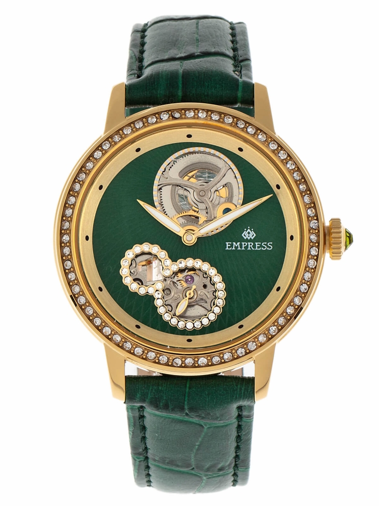 Gold-tone stainless steel case with a green genuine leather strap. Fixed gold crystal set bezel. Green dial with gold-tone hands and index hour markers. Dial Type: Analog. Luminescent hands. Automatic movement with a 28-hour power reserve. Scratch resistant mineral crystal. Pull / push crown. Transparent case back. Round case shape, case size: 38 mm, case thickness: 11 mm. Band width: 18 mm. Buckle clasp. Water resistant at 50 meters / 165 feet. Functions: hour, minute. Dress watch style. Watch label: Chinese Movt. Item Variations: EMPEM2904. Empress Tatiana Automatic Crystal Green Dial Ladies Watch EMPEM2904.