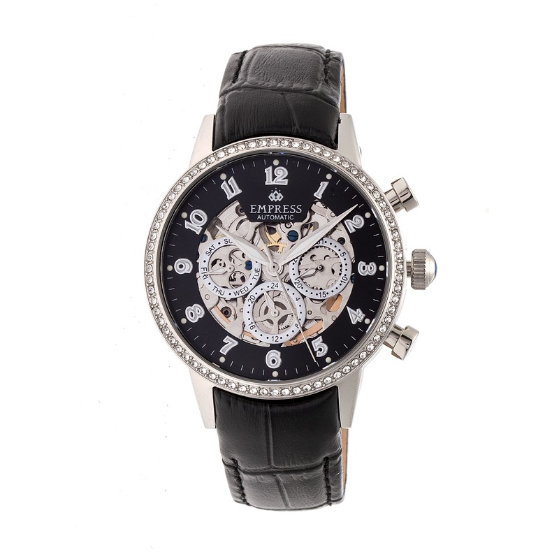 Silver-tone stainless steel case with a black crocodile-embossed leather strap. Fixed silver-tone stainless steel bezel. Black skeleton dial with silver-tone hands and Arabic numeral hour markers. Minute markers around the outer rim. Dial Type: Analog. Luminescent hands and markers. Date/day display. Three - day, date and 24 hour subdials. Automatic movement with a 36-hour power reserve. Scratch resistant sapphire-coated mineral crystal. Skeleton transparent exhibition see through case back. Case size: 38 mm. Round case shape. Buckle clasp. Water resistant at 30 meters / 100 feet. Functions: date, day, hour, minute, second. Additional Info: average gain/loss rate: +/- 45 seconds per day. Dress watch style. Empress Beatrice Black Skeleton Dial Black Leather Strap Ladies Watch EM2002.