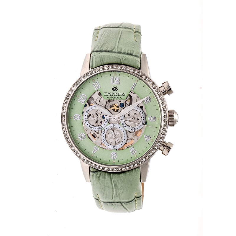Silver-tone stainless steel case with a green crocodile-embossed leather strap. Fixed silver-tone stainless steel with crystals bezel. Green skeleton dial with silver-tone hands and Arabic numeral hour markers. Minute markers around the outer rim. Dial Type: Analog. Luminescent hands and markers. Date/day display. Three - day, date and 24 hour subdials. Automatic movement with a 36-hour power reserve. Scratch resistant sapphire-coated mineral crystal. Skeleton transparent exhibition see through case back. Case size: 38 mm. Round case shape. Buckle clasp. Water resistant at 30 meters / 100 feet. Functions: date, day, hour, minute, second. Additional Info: average gain/loss rate: +/- 45 seconds per day. Dress watch style. Empress Beatrice Green Skeleton Dial Green Leather Strap Ladies Watch EM2003.
