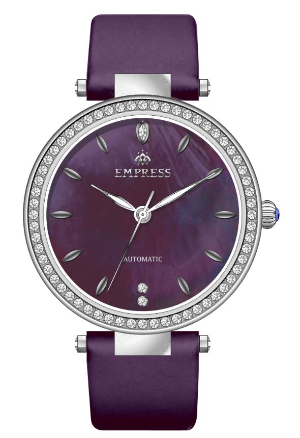 Silver-tone stainless steel case with a purple leather strap. Fixed crystals bezel. Purple dial with silver-tone hands and index hour markers. Dial Type: Analog. Luminescent hands. Automatic movement. Scratch resistant mineral crystal. Round case shape, case size: 36 mm, case thickness: 13 mm. Band width: 16 mm. Buckle clasp. Water resistant at 50 meters / 165 feet. Functions: hour, minute, second. Dress watch style. Item Variations: EMPEM2302. Empress Louise Automatic Crystal Purple Dial Ladies Watch EMPEM2302.