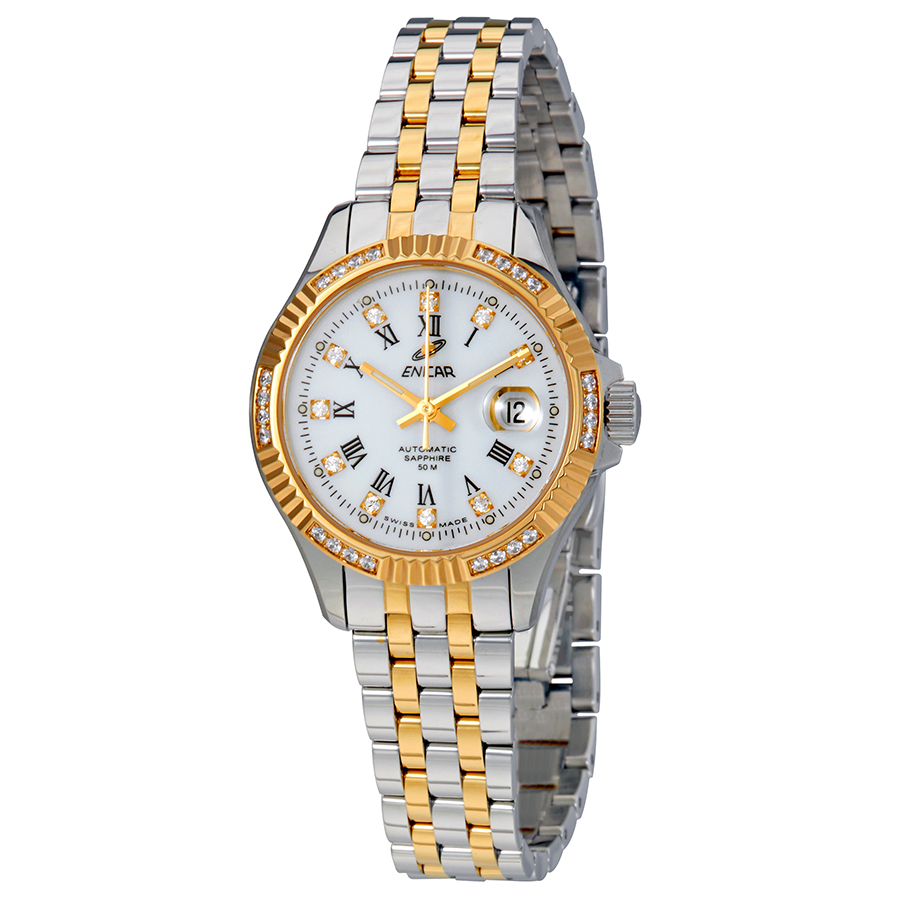 Stainless steel case with a two-tone (silver and yellow gold-tone) stainless steel bracelet. Fixed yellow gold-tone bezel set with zirconia crystals. White dial with luminous yellow gold-tone hands and zirconia crystal / Roman numeral hour markers. Minute markers around the outer rim. Dial Type: Analog. Luminescent hands and markers. Date display at the 3 o'clock position. Automatic movement. Scratch resistant sapphire crystal. Pull / push crown. Transparent case back. Round case shape. Case size: 28 mm. Fold over clasp with a push button release. Water resistant at 50 meters / 165 feet. Functions: date, hour, minute, second. Dress watch style. Watch label: Swiss Made. Enicar Prestige Automatic Crystal White Dial Ladies Watch 778/50/329GS.