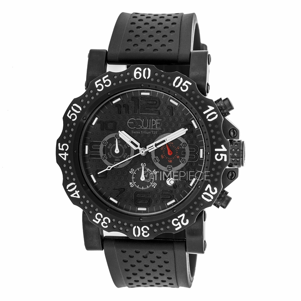 Black stainless steel case with a black rubber strap. Rotating black bezel. Black dial with silver-tone hands and Arabic numeral hour markers. Minute markers around the outer rim. Dial Type: Analog. Luminescent hands and markers. Date display between 4 and 5 o'clock position. Chronograph - three sub-dials displaying: 60 second, 60 minute and 24 hour. Miyota Caliber quartz movement. Scratch resistant mineral crystal. Screw down crown. Round case shape, case size: 49 mm, case thickness: 14 mm. Band width: 23 mm. Buckle clasp. Water resistant at 200 meters / 660 feet. Functions: chronograph, date, GMT, second time zone, hour, minute, second. Additional Info: dual illumination system super luminova and tritium tubes Swiss t25 mb micro tec. Sport watch style. Watch label: Japan Movt. Item Variations: EQUET205. Equipe Tritium Rivet Chronograph Black Dial Mens Watch ET205.