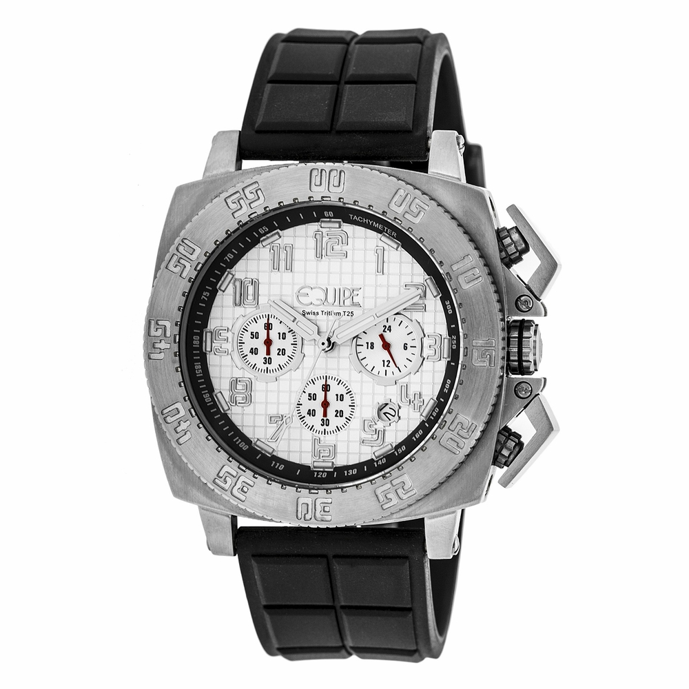 Silver-tone stainless steel case with a black rubber strap. Rotating silver-tone bezel. White dial with silver-tone hands and Arabic numeral hour markers. Minute markers around the outer rim. Dial Type: Analog. Luminescent hands and markers. Date display between 4 and 5 o'clock position. Chronograph - three sub-dials displaying: 60 second, 60 minute and 24 hour. Miyota Caliber quartz movement. Scratch resistant mineral crystal. Screw down crown. Round case shape, case size: 45 mm, case thickness: 14 mm. Band width: 23 mm. Buckle clasp. Water resistant at 200 meters / 660 feet. Functions: chronograph, date, GMT, second time zone, hour, minute, second. Additional Info: dual illumination system super luminova and tritium tubes Swiss t25 mb micro tec. Dive watch style. Watch label: Japan Movt. Item Variations: EQUET307. Equipe Tritium Push Chronograph White Dial Mens Watch ET307.