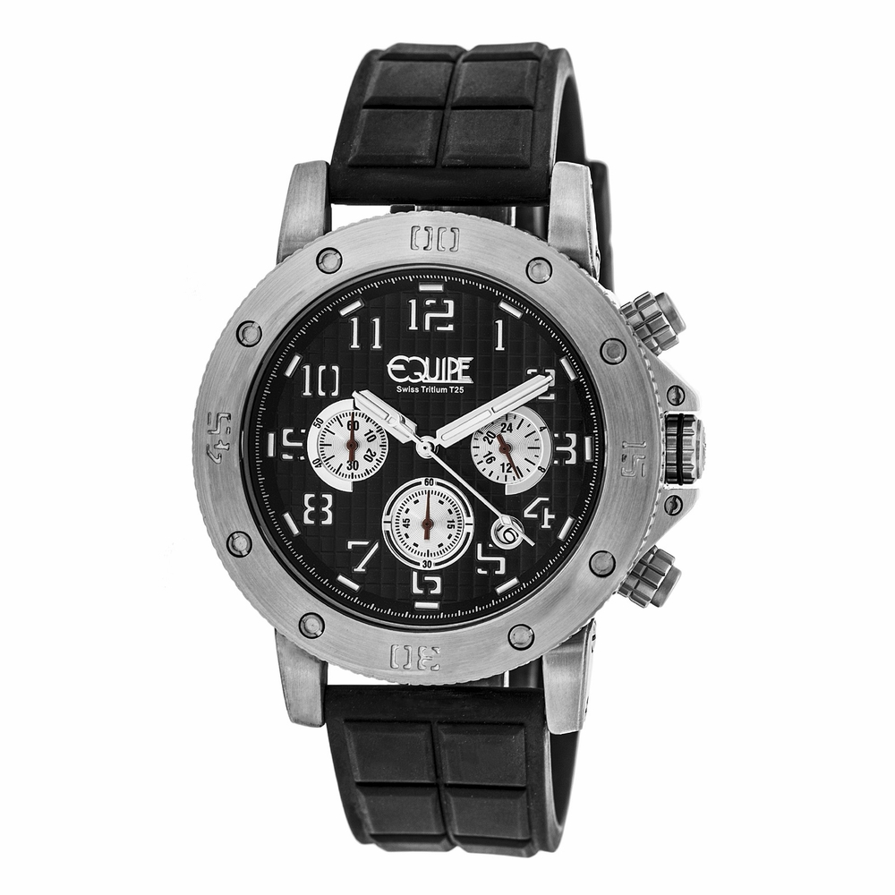 Silver-tone stainless steel case with a black rubber strap. Rotating silver-tone bezel. Black dial with silver-tone hands and Arabic numeral hour markers. Minute markers around the outer rim. Dial Type: Analog. Luminescent hands and markers. Date display between 4 and 5 o'clock position. Chronograph - three sub-dials displaying: 60 second, 60 minute and 24 hour. Miyota Caliber quartz movement. Scratch resistant mineral crystal. Screw down crown. Round case shape, case size: 45 mm, case thickness: 14 mm. Band width: 20 mm. Buckle clasp. Water resistant at 200 meters / 660 feet. Functions: chronograph, date, GMT, second time zone, hour, minute, second. Additional Info: dual illumination system super luminova and tritium tubes Swiss t25 mb micro tec. Dive watch style. Watch label: Japan Movt. Item Variations: EQUET407. Equipe Tritium Arciform Chronograph Black Dial Mens Watch ET407.