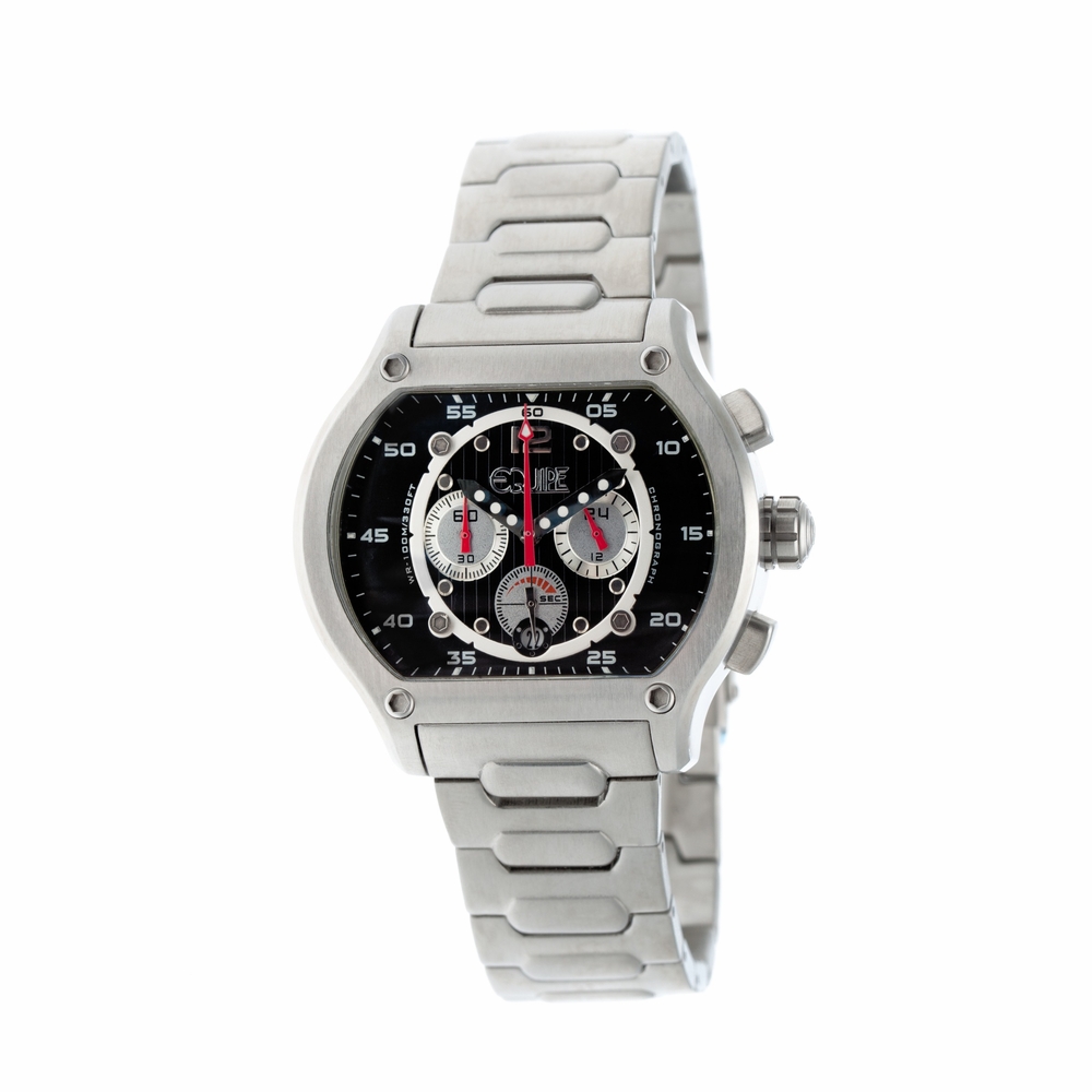 Silver-tone stainless steel case with a silver-tone stainless steel bracelet. Band width: 22mm. Black dial with analog display and date display between 4 and 5 o'clock position. Case diameter: 44mm. Case thickness: 13mm. Quartz movement. Mineral crystal. Screw-down crown. Screw-in caseback. Fold over push button deployment clasp. Functions: Chronograph, Hour, Minute, Second. Water resistant: 100 meters (330 feet).