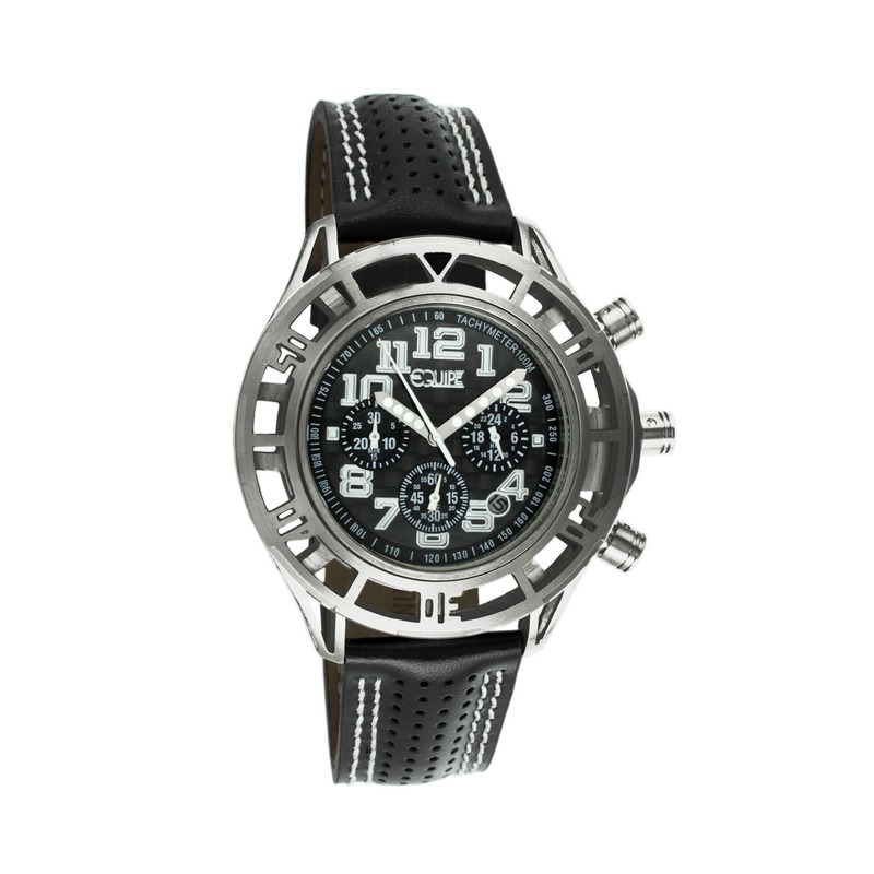 Black IP stainless steel case with a black leather strap. Band width: 22mm. Black dial with analog display and date display between 4 and 5 o'clock position. Case diameter: 50mm. Case thickness: 13mm. Quartz movement. Mineral crystal. Screw-down crown. Screw-in caseback. Tang clasp. Functions: Chronograph, Hour, Minute, Second. Water resistant: 100 meters (330 feet).