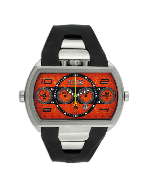 Stainless steel case with a black rubber strap. Fixed stainless steel bezel. Orange dial with luminous hands and index hour markers. Arabic numerals mark the 2, 4, 8 and 10 o'clock positions. Minute markers. Dial Type: Analog. Date display between 4 and 5 o'clock positions. Five sub-dials displaying: 60 seconds, 60 minutes, two x 12 hour and 24 hour (dual time). Quartz movement. Scratch resistant mineral crystal. Screw down crown. Screw-in case back. Case diameter: 60 mm. Case thickness: 13 mm. Tonneau case shape. Band width: 39 mm. Tang clasp. Water resistant at 100 meters (330 feet). Functions: chronograph, hour, minute, second. Sport watch style. Equipe Dash XXL Mens Watch E916