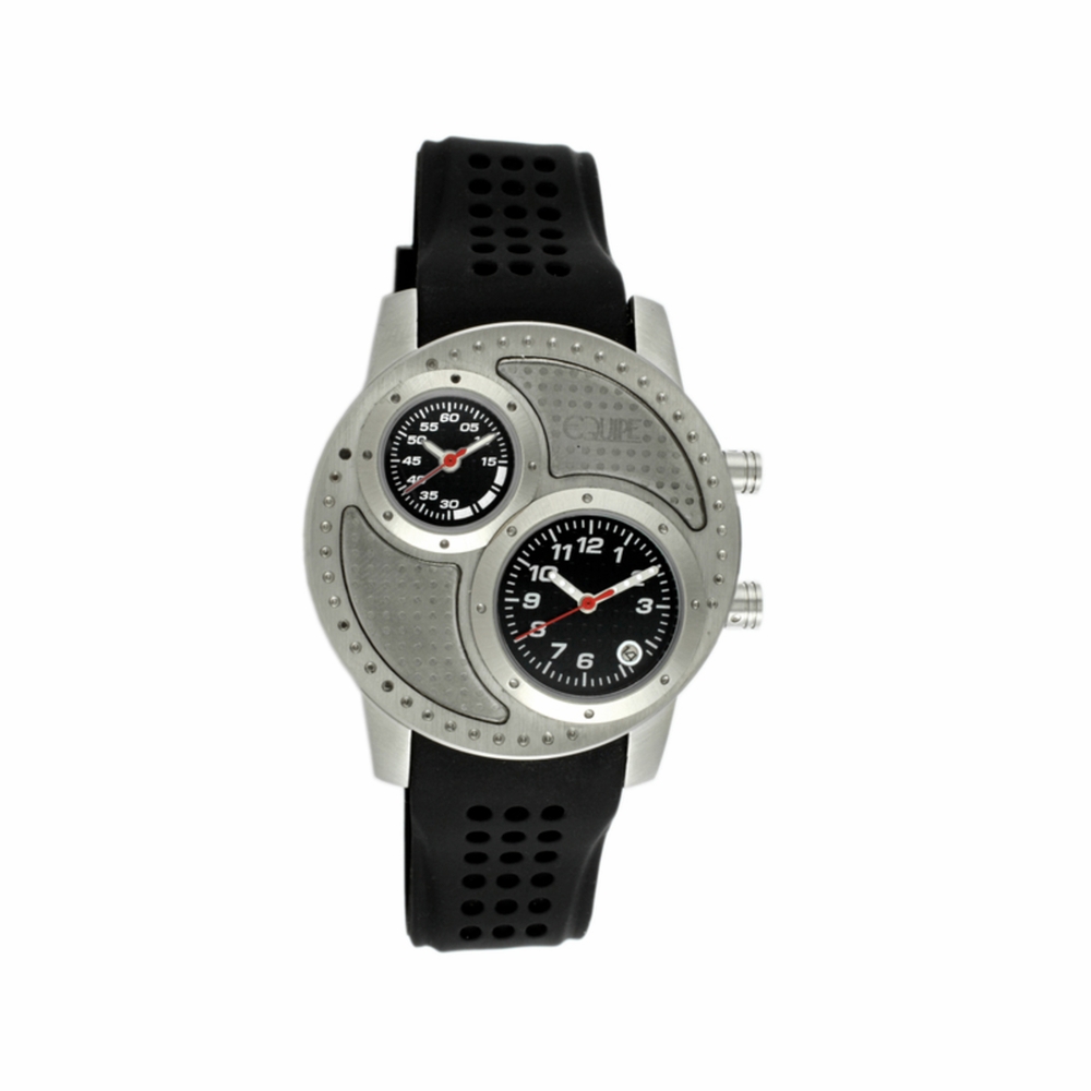 Silver-tone stainless steel case with a black rubber strap. Band width: 21mm. Black dial with analog display, luminous hands, and date display between 4 and 5 o'clock position. Case diameter: 44mm. Case thickness: 10mm. Quartz movement. Mineral crystal. Screw-down crown. Screw-in caseback. Tang clasp. Functions: Hour, Minute, Second. Water resistant: 100 meters (330 feet).