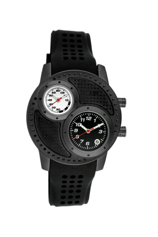 Black IP stainless steel case with a black rubber strap. Band width: 21mm. Black And White dial with analog display, luminous hands, and date display between 4 and 5 o'clock position. Case diameter: 44mm. Case thickness: 10mm. Quartz movement. Mineral crystal. Screw-down crown. Screw-in caseback. Tang clasp. Functions: Hour, Minute, Second. Water resistant: 100 meters (330 feet).