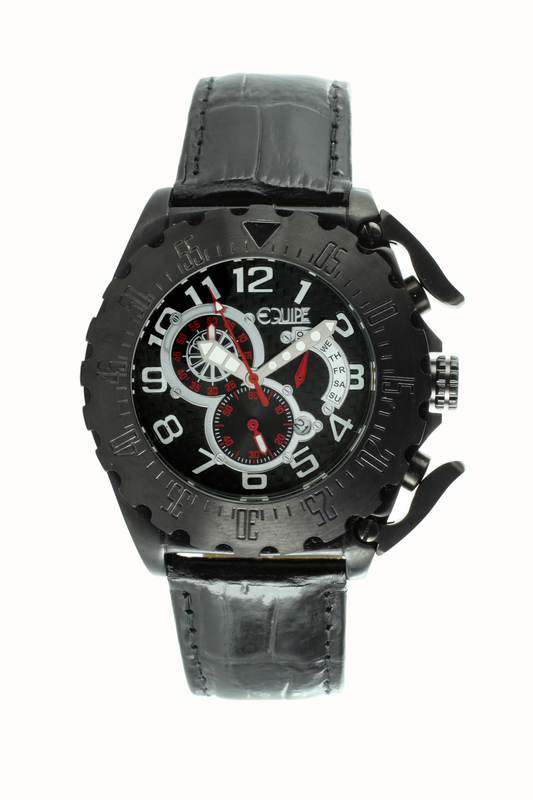 Black IP stainless steel case with a black leather strap. Band width: 24mm. Black dial with analog display and date display between 4 and 5 o'clock position. Case diameter: 46mm. Case thickness: 13mm. Quartz movement. Mineral crystal. Screw-down crown. Screw-in caseback. Tang clasp. Functions: Chronograph, Date, Hour, Minute, Second. Water resistant: 100 meters (330 feet).
