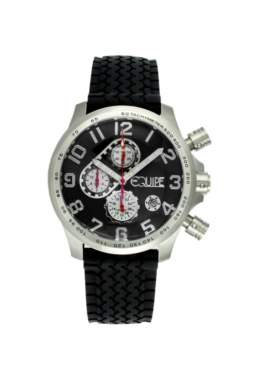 Silver-tone stainless steel case with a black rubber strap. Band width: 24mm. Black dial with analog display and date display at the 4 o'clock position. Tachymeter. Case diameter: 47mm. Case thickness: 10mm. Quartz movement. Mineral crystal. Screw-down crown. Screw-in caseback. Tang clasp. Functions: Chronograph, Hour, Minute, Second. Water resistant: 100 meters (330 feet).