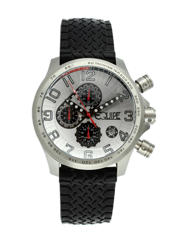 Stainless steel case with a black rubber strap. Fixed stainless steel bezel with tachymeter. Silver dial with luminous hands and Arabic numeral hour markers. Minute markers around the outer rim. Dial Type: Analog. Luminescent hands. Date display at the 4 o'clock position. Chronograph - three sub-dials displaying: 60 second, 12 hour and 1/20th of a second. Quartz movement. Scratch resistant mineral crystal. Screw down crown. Screw in case back. Case diameter: 47 mm. Case thickness: 10 mm. Round case shape. Band width: 24 mm. Fold over deployment clasp. Water resistant at 100 meters (330 feet). Functions: chronograph, hour, minute, second. Casual watch style. Equipe Hemi Mens Watch Q502.