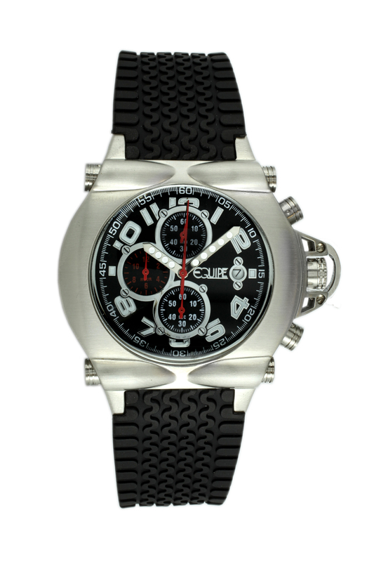 Stainless steel case with a black rubber strap. Fixed stainless steel bezel. Black dial with luminous hands and Arabic numeral hour markers. Minute markers around the outer rim. Dial Type: Analog. Luminescent hands. Date display at the 3 o'clock position. Chronograph - three sub-dials displaying: 60 second, 60 minute and 12 hour. Quartz movement. Scratch resistant mineral crystal. Screw down crown. Screw in case back. Case diameter: 45mm. Case thickness: 13mm. Tonneau case shape. Band width: 25mm. Tang clasp. Water resistant at 100 meters (330 feet). Functions: chronograph, hour, minute, second. Sport watch style. Equipe Rollbar Mens Watch Q601.