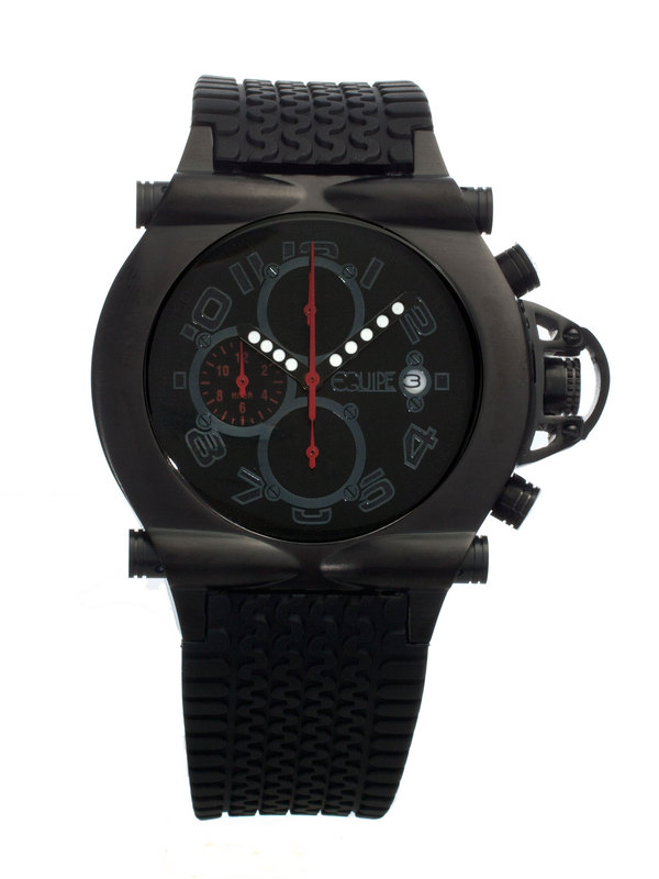 Black ion-plated stainless steel case with a black rubber strap. Fixed black ion-plated bezel. Black dial with luminous hands and Arabic numeral hour markers. Dial Type: Analog. Luminescent hands. Date display at the 3 o'clock position. Chronograph - three sub-dials displaying: 60 second, 30 minute and 24 hour. Quartz movement. Scratch resistant mineral crystal. Screw down crown. Screw-in case back. Case diameter: 45 mm. Case thickness: 13 mm. Tonneau case shape. Band width: 25 mm. Tang clasp. Water resistant at 100 meters (330 feet). Functions: chronograph, hour, minute, second. Sport watch style. Equipe Rollbar Mens Watch Q609.