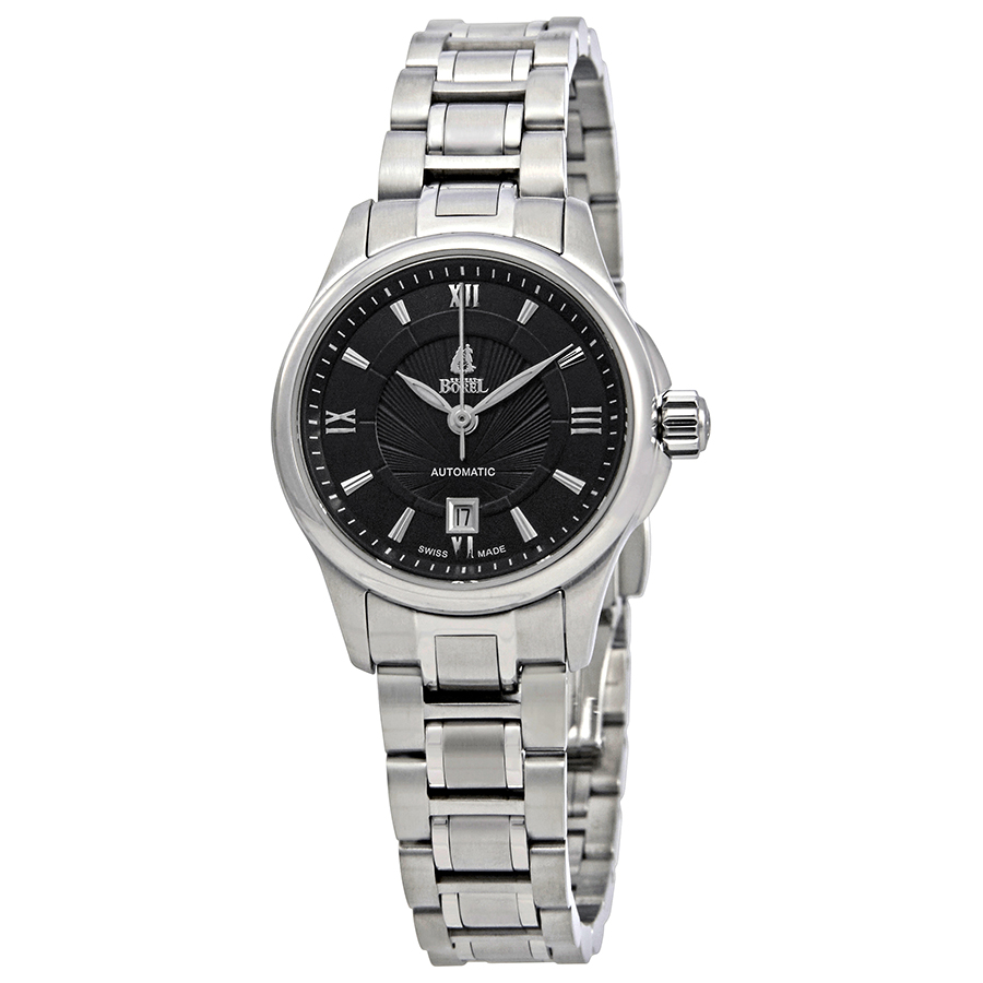 Silver-tone stainless steel case with a silver-tone stainless steel bracelet. Fixed silver-tone stainless steel bezel. Black dial with silver-tone hands and index and Roman numeral hour markers. Minute markers around the outer rim. Dial Type: Analog. Date display at the 6 o'clock position. Automatic movement. Scratch resistant sapphire crystal. Pull / push crown. Round case shape. Deployment clasp. Water resistant at 50 meters / 165 feet. Functions: date, hour, minute, second. Dress watch style. Ernest Borel Braque Black Dial Stainless Steel Ladies Watch LS7350-5522A.