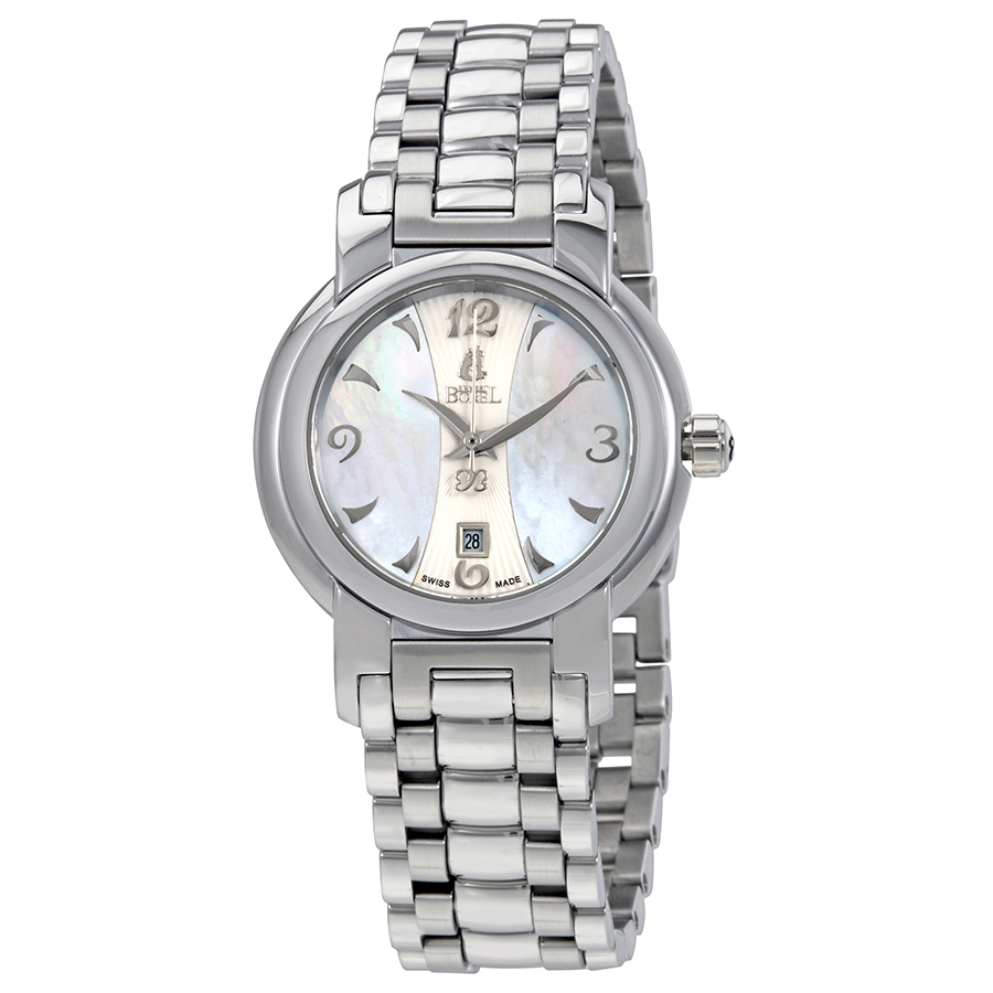 Silver-tone stainless steel case with a silver-tone stainless steel bracelet. Fixed silver-tone stainless steel bezel. Silver dial with silver-tone hands and index and Arabic numeral hour markers. Dial Type: Analog. Date display at the 6 o'clock position. Quartz movement. Scratch resistant sapphire crystal. Case size: 32 mm. Round case shape. Deployment clasp. Water resistant at 50 meters / 165 feet. Functions: date, hour, minute, second. Dress watch style. Watch label: Swiss Made. Ernest Borel Romance Silver Dial Stainless Steel Ladies Watch QBS1856-4022.