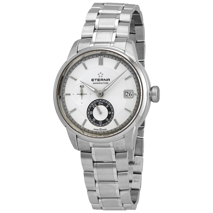 Stainless steel case with a stainless steel bracelet. Fixed stainless steel bezel. Silver dial with luminous silver-tone hands and index hour markers. Minute markers around the outer rim. Dial Type: Analog. Luminescent hands and markers. Date display at the 3 o'clock position. Two sub-dials displaying: small second and 24 hour. Calibre Maison 3914A, automatic movement with a 65-hour power reserve. Scratch resistant sapphire crystal. Pull / push crown. Transparent case back. Round case shape. Case size: 42 mm. Case thickness: 12.69 mm. Band width: 21 mm. Band length: 8 inches. Deployment clasp with a push button release. Water resistant at 50 meters / 165 feet. Functions: date, hour, minute, small second, 24 hour, GMT. Luxury watch style. Watch label: Swiss Made. Eterna Adventic Automatic GMT Silver Dial Mens Watch 7661.41.66.1702.