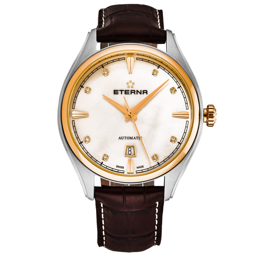 Silver-tone stainless steel case with a brown leather strap. Fixed yellow gold-tone stainless steel bezel. Mother of pearl dial with yellow gold-tone hands and index hour markers. Minute markers around the outer rim. Dial Type: Analog. Date display at the 6 o'clock position. Automatic movement. Scratch resistant sapphire crystal. Pull / push crown. Transparent case back. Round case shape, case size: 42 mm, case thickness: 11 mm. Band width: 20 mm, band length: 8 inches. Buckle clasp. Functions: date, hour, minute, second. Avant Garde Series. Luxury watch style. Watch label: Swiss Made. Eterna Avant Garde Automatic Mens Watch 2945.53.66.1260.