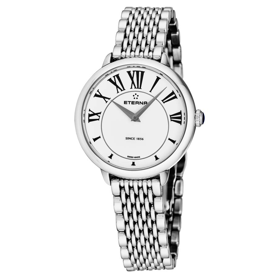 Stainless steel case with a stainless steel bracelet. Fixed stainless steel bezel. White dial with silver-tone hands and Roman numeral and index hour markers. Dial Type: Analog. ETA Caliber 956.412 quartz movement. Scratch resistant sapphire crystal. Pull / push crown. Solid case back. Round case shape. Case size: 34 mm. Case thickness: 6.5 mm. Band width: 18 mm. Band length: 7 inches. Deployment clasp with a push button release. Water resistant at 50 meters / 165 feet. Functions: hour, minute. Dress watch style. Watch label: Swiss Made. Eterna Eternity Quartz White Dial Ladies Watch 2800.41.62.1743.