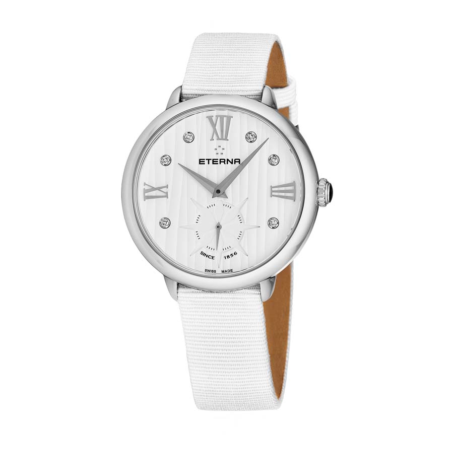 Stainless steel case with a white (gros grain) fabric strap. Fixed stainless steel bezel. White dial with silver-tone dauphine-style hands and diamond hour markers. Roman numerals mark the 3, 9 and 12 o'clock positions. Dial Type: Analog. Small seconds sub-dial. Ronda caliber R6004.D quartz movement. Scratch resistant sapphire crystal. Pull / push crown. Solid case back. Round case shape. Case size: 34 mm. Case thickness: 6.5 mm. Band width: 14 mm. Band length: 7 inches. Tang clasp. Water resistant at 50 meters / 165 feet. Functions: hour, minute, small second. Eternity Series. Casual watch style. Watch label: Swiss Made. Eterna Eternity Quartz Diamond White Dial Ladies Watch 2801.41.96.1406.