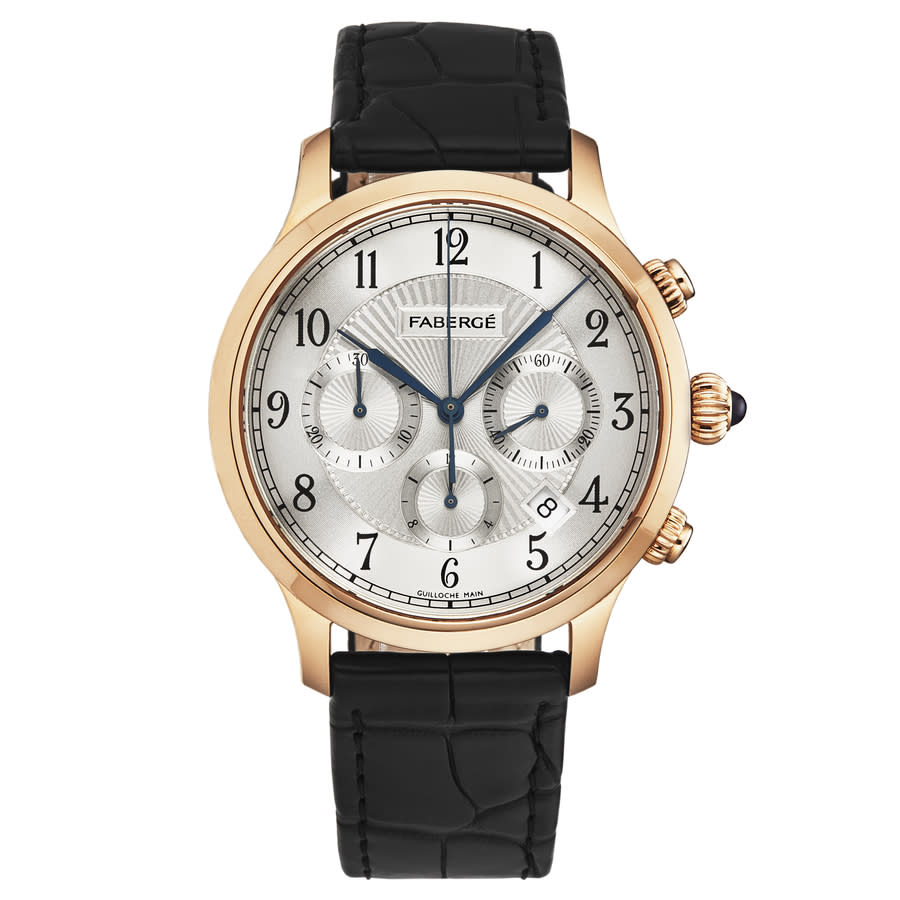 Rose gold-tone 18kt rose gold case with a black leather strap. Fixed rose gold-tone 18kt rose gold bezel. Silver-tone dial with blue hands and Arabic numeral hour markers. Minute markers around the outer rim. Dial Type: Analog. Date display between 4 and 5 o'clock position. Chronograph - three sub-dials displaying: 60 second, 30 minute and 12 hour. Automatic movement. Scratch resistant sapphire crystal. Pull / push crown. Transparent case back. Round case shape, case size: 40 mm, case thickness: 13 mm. Band width: 20 mm, band length: 8 inches. Deployment with push button release clasp. Water resistant at 50 meters / 165 feet. Functions: chronograph, date, hour, minute, second. Additional Info: hour, minute, second, date, chronograph. Agathon Series. Luxury watch style. Faberge Agathon Chronograph Automatic Silver Dial Mens Watch FAB-208.