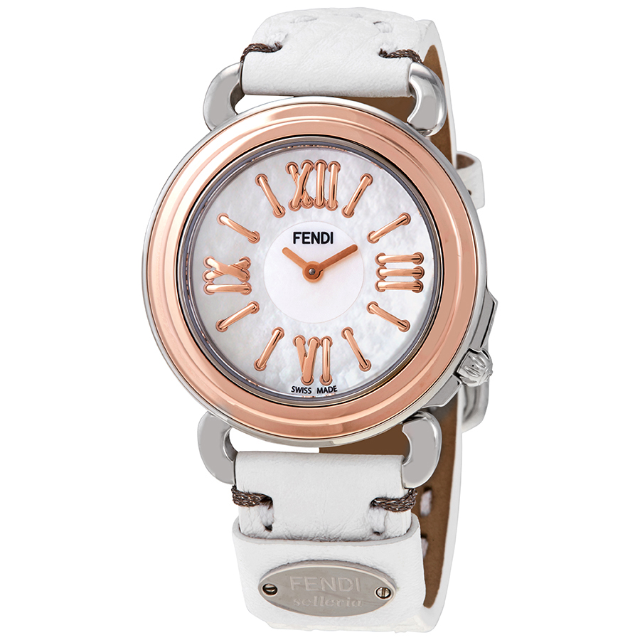 Silver/rose gold-tone stainless steel case with a leather strap. Fixed bezel. Mother of pearl dial with rose gold-tone hands and index-Roman numerals hour markers. Dial Type: Analog. Quartz movement. Scratch resistant sapphire crystal. Pull / push crown. Solid case back. Round case shape, case size: 37 mm, case thickness: 9.5 mm. Water resistant at 50 meters / 165 feet. Functions: hour, minute. Dress watch style. Watch label: Swiss Made. Fendi Selleria Mother of Pearl Dial Ladies Watch F8012345H0/SET1.