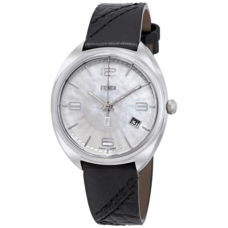 Stainless steel case with a black (alligator and calfskin) leather strap. Fixed stainless steel bezel. Mother of pearl dial with silver-tone hands and index hour markers. Arabic numerals mark the 3, 6, 9 and 12 o'clock positions. Minute markers around the outer rim. Dial Type: Analog. Date display at the 4 o'clock position. Quartz movement. Scratch resistant sapphire crystal. Solid case back. Round case shape. Case size: 34 mm. Case thickness: 8 mm. Band width: 16 mm. Tang clasp. Water resistant at 100 meters / 330 feet. Functions: date, hour, minute, second. Dress watch style. Watch label: Swiss Made. Fendi Momento Mother of Pearl Dial Ladies Watch F217034511.