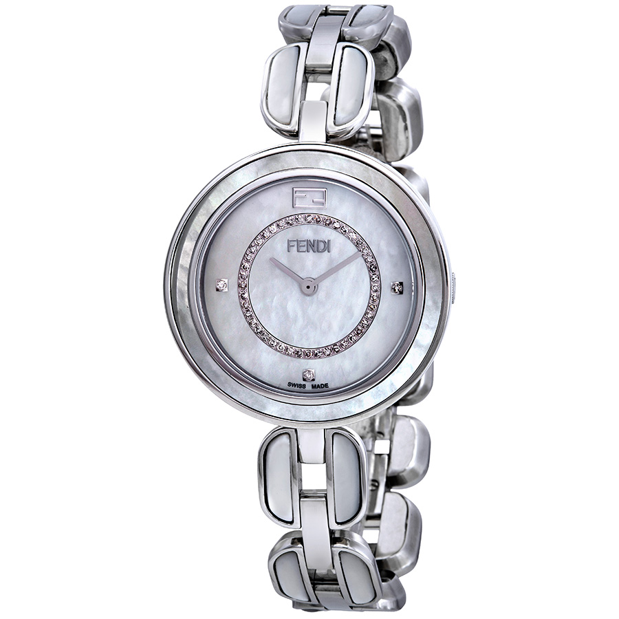 Stainless steel case with a stainless steel bangle bracelet with mother of pear inlays. Fixed stainless steel bezel featuring mother of pearl inlays. Mother of pearl dial with silver-tone hands. Diamond numerals mark the 3,6, and 9 o' clock o'clock positions. Dial Type: Analog. Quartz movement. Scratch resistant sapphire crystal. Pull / push crown. Solid case back. Round case shape. Case size: 36 mm. Case thickness: 9.5 mm. Jewelry clasp. Water resistant at 50 meters / 165 feet. Functions: hour, minute. Dress watch style. Watch label: Swiss Made. Fendi My Way Mother of Pearl Diamond Dial Ladies Watch F361034500D3.