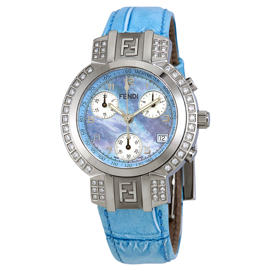 Silver-tone stainless steel case with a blue leather strap. Fixed, diamond set silver-tone stainless steel bezel. Blue mother of pearl dial with silver-tone hands and Arabic numeral hour markers. Tachymeter. Dial Type: Analog. Date display at the 4 o'clock position. Chronograph - three sub-dials displaying: 60 second, 30 minute and 1/10th of a second. Quartz movement. Scratch resistant sapphire crystal. Solid case back. Case size: 33 mm x 43 mm. Round case shape. Water resistant at 50 meters / 165 feet. Functions: chronograph, date, hour, minute, second. Dress watch style. Watch label: Swiss Made. Fendi Zucca Blue Mother of Pearl Dial Ladies Chronograph Watch F451233BDC.