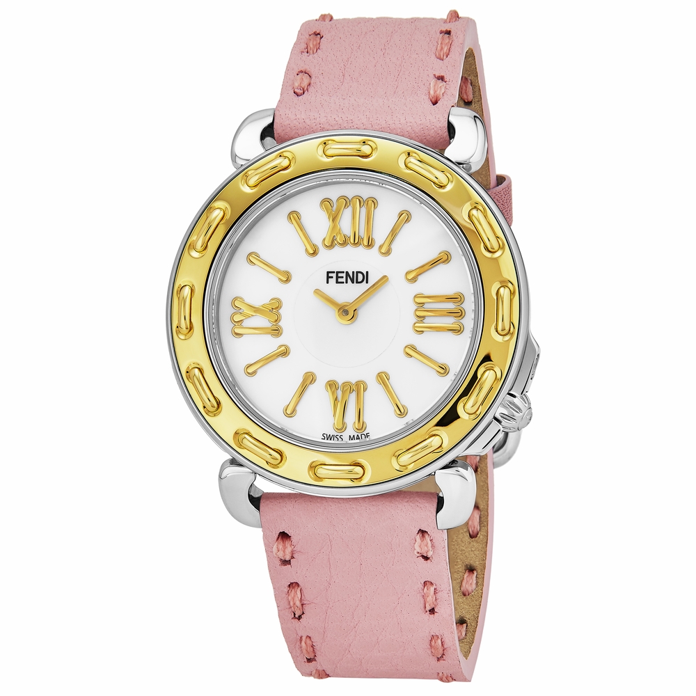 Silver-tone polished stainless steel case with a pink leather strap. Fixed gold-tone stainless steel bezel. Mother of pearl dial with gold-tone hands and Roman numeral hour markers. Dial Type: Analog. Quartz movement. Scratch resistant sapphire crystal. Pull / push crown. Solid case back. Round case shape, case size: 35 mm, case thickness: 9.5 mm. Band width: 18 mm, band length: 7 inches. Buckle clasp. Water resistant at 50 meters / 165 feet. Functions: hour, minute. Dress watch style. Watch label: Swiss Made. Fendi Selleria Ladies Pink Leather Watch F8001345H0.SN07.