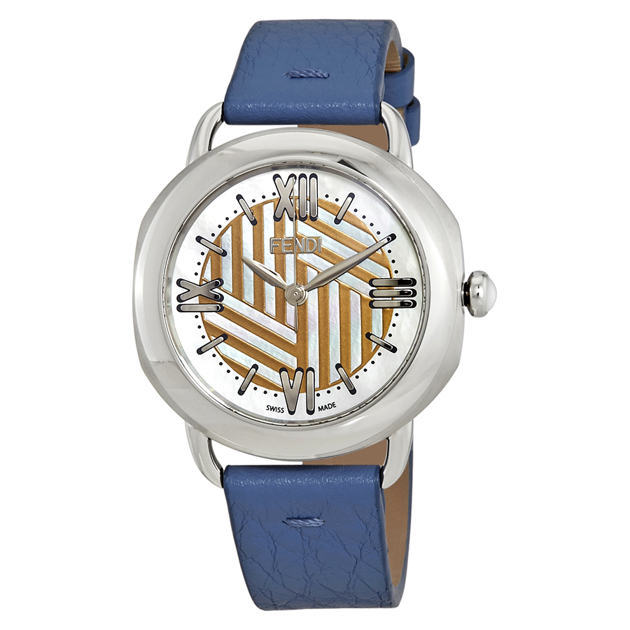 . Stainless steel case with a blue leather strap. Fixed stainless steel bezel. White mother of pearl (gold pattern) dial with silver-tone hands and index hour markers. Roman numerals mark the 3, 6, 9 and 12 o'clock positions. Minute markers. Dial Type: Analog. Quartz movement. Scratch resistant sapphire crystal. Pull / push crown. Solid case back. Round case shape. Case size: 36 mm. Tang clasp. Water resistant at 50 meters / 165 feet. Functions: hour, minute, second. Casual watch style. Watch label: Swiss Made. Fendi Selleria Mother of Pearl Dial Ladies Watch F8110355H0-BL.