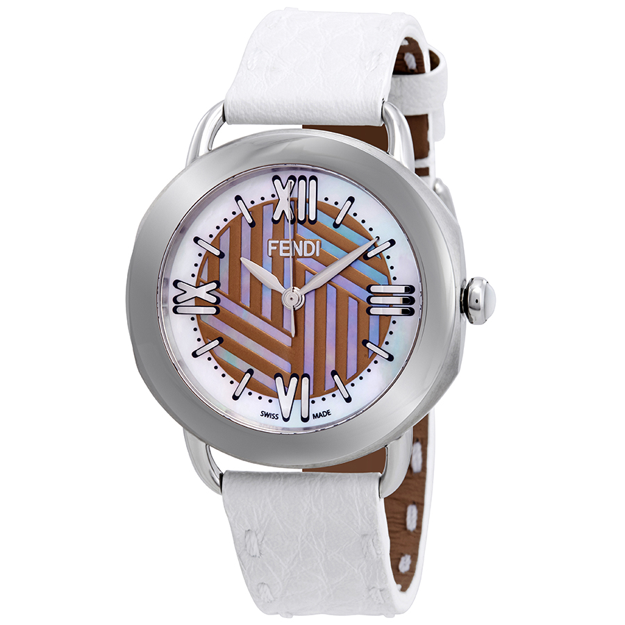 Stainless steel case with a white leather strap. Fixed stainless steel bezel. White mother of pearl (red pattern) dial with silver-tone hands and index hour markers. Roman numerals mark the 3, 6, 9 and 12 o'clock positions. Minute markers. Dial Type: Analog. Quartz movement. Scratch resistant sapphire crystal. Pull / push crown. Solid case back. Round case shape. Case size: 36 mm. Tang clasp. Water resistant at 50 meters / 165 feet. Functions: hour, minute, second. Casual watch style. Watch label: Swiss Made. Fendi Selleria Mother of Pearl Dial Ladies Watch F8110355H0-WH.