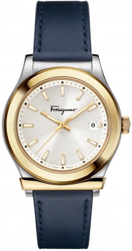 Stainless steel case with a blue leather strap. Fixed gold-tone bezel. White silver guilloche dial with luminous gold-tone hands and index hour markers. Minute markers around the outer rim. Dial Type: Analog. Luminescent hands and markers. Date display at the 3 o'clock position. Quartz movement. Scratch resistant sapphire crystal. Pull / push crown. Solid case back. Round case shape. Case size: 40 mm. Case thickness: 9.2 mm. Band width: 20 mm. Fold over clasp. Water resistant at 30 meters / 100 feet. Functions: date, hour, minute, second. 1898 Series. Dress watch style. Watch label: Swiss Made. Ferragamo 1898 Quartz White Dial Blue Leather Mens Watch SFDG00118.