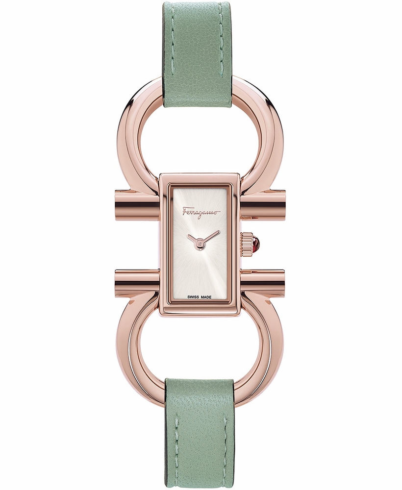 Rose gold-tone stainless steel case with a green leather strap. Fixed rose gold-tone stainless steel bezel. White-silver dial with rose gold-tone hands. No markers. Dial Type: Analog. Quartz movement. Scratch resistant sapphire crystal. Pull / push crown. Solid case back. Rectangle case shape. Case dimensions: 13.5 mm x 23.5 mm. Case thickness: 6.4 mm. Band width: 12 mm. Tang clasp. Water resistant at 30 meters / 100 feet. Functions: hour, minute. Double Gancini Series. Dress watch style. Watch label: Swiss Made. Ferragamo Double Gancini Quartz Ladies Watch SFDO00619.