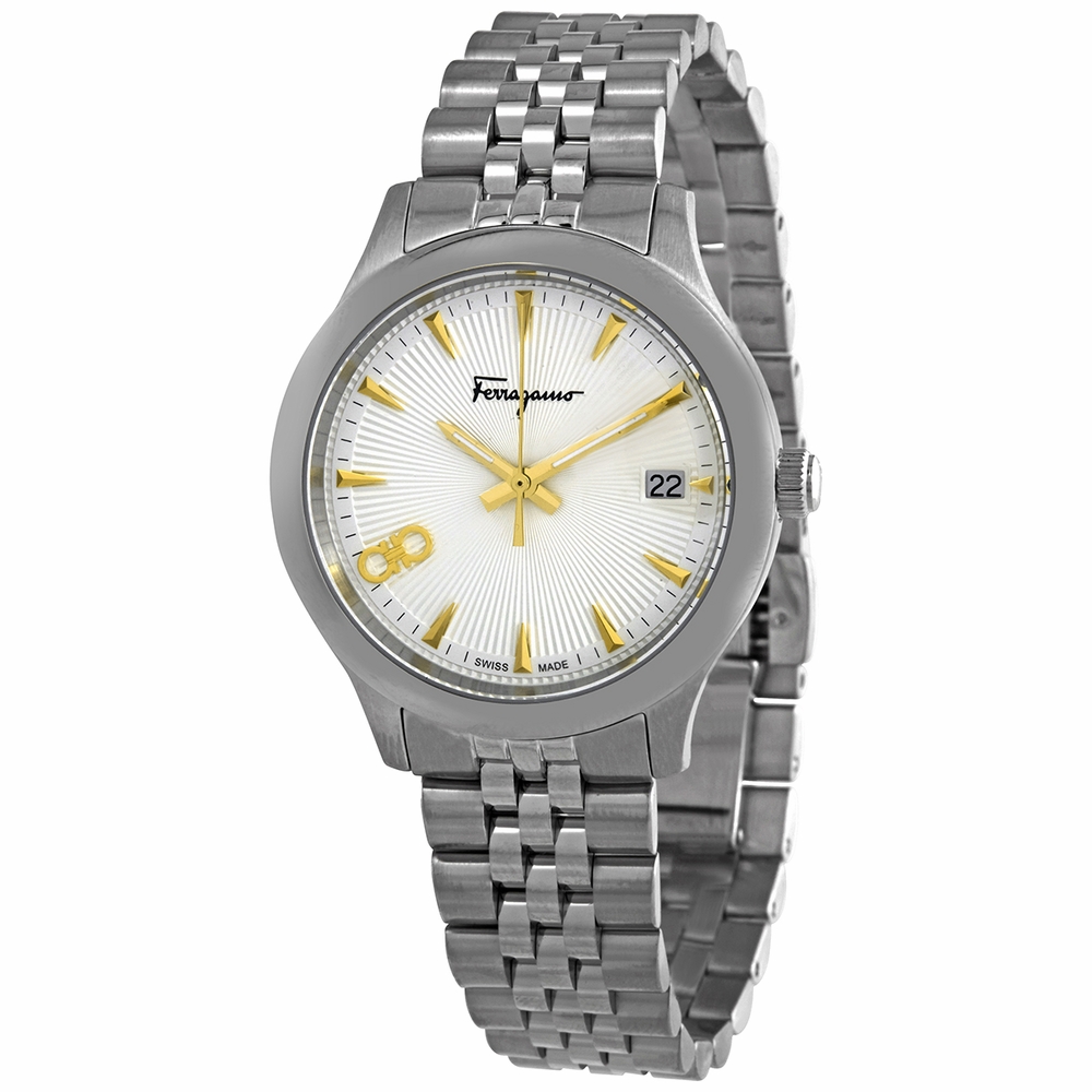Stainless steel case with a stainless steel bracelet. Fixed stainless steel bezel. White silver dial with luminous gold-tone hands and index hour markers. Minute markers around the outer rim. The Double Gancini logo appears at the 8 o'clock position. Dial Type: Analog. Luminescent hands. Date display at the 3 o'clock position. Quartz movement. Scratch resistant sapphire crystal. Pull / push crown. Solid case back. Round case shape. Case size: 33 mm. Case thickness: 8.4 mm. Bracelet width: 16 mm. Butterfly clasp with a push button release. Water resistant at 50 meters / 165 feet. Functions: date, hour, minute, second. Duo Series. Dress watch style. Watch label: Swiss Made. Ferragamo Duo Quartz White Silver Dial Ladies Watch SFCU00119.