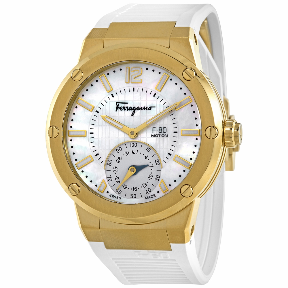 Yellow gold-tone stainless steel case with a white (silicone) rubber strap. Fixed yellow gold-tone bezel. Hybrid mother of pearl dial with luminous yellow gold-tone hands and index hour markers. An Arabic numeral appears at the 12 o'clock position. Minute markers around the outer rim. Dial Type: Analog. Luminescent hands and markers. Combination date / 100th second sub-dial. Quartz movement. Scratch resistant sapphire crystal. Solid case back. Round case shape. Case size: 44 mm. Case thickness: 12 mm. Band width: 24 mm. Deployment clasp. Water resistant at 30 meters / 100 feet. Functions: hour, minute, activity and sleep pattern tracking, adaptive coaching, smart sleep alarm. Additional Info: connected via bluetooth to ios or android devices. F-80 Series. Sport watch style. Watch label: Swiss Made. Ferragamo F-80 Alarm Quartz Ladies Smart Watch SFAZ00218.