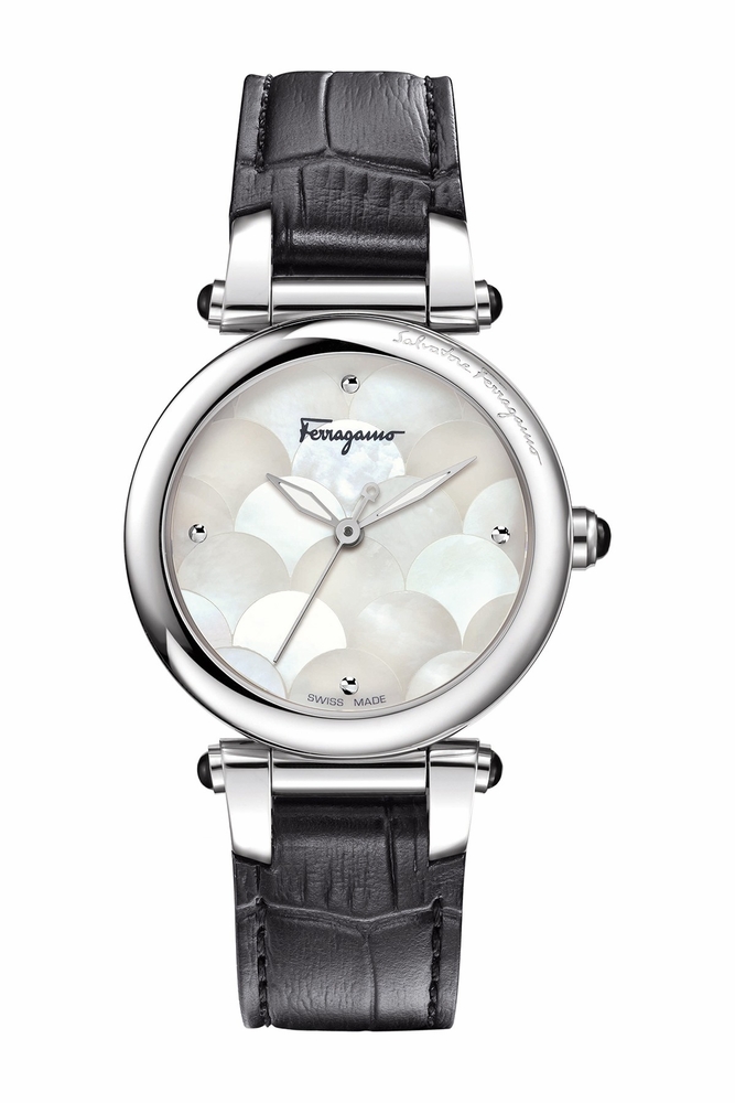 Silver-tone stainless steel case with a black (calfskin) leather strap. Fixed silver-tone stainless steel bezel. Mother of pearl dial with luminous silver-tone leaf-style shape hands. Dots mark the 3, 6, 9 and 12 o'clock positions. Dial Type: Analog. Luminescent hands. Quartz movement. Scratch resistant sapphire crystal. Pull / push crown. Solid case back. Round case shape, case size: 34 mm, case thickness: 10 mm. Band width: 17.5 mm. Tang clasp. Water resistant at 30 meters / 100 feet. Functions: hour, minute, second. Casual watch style. Watch label: Japan Movt. Ferragamo Idillio Quartz Mother of Pearl Dial Ladies Watch FI2010013.