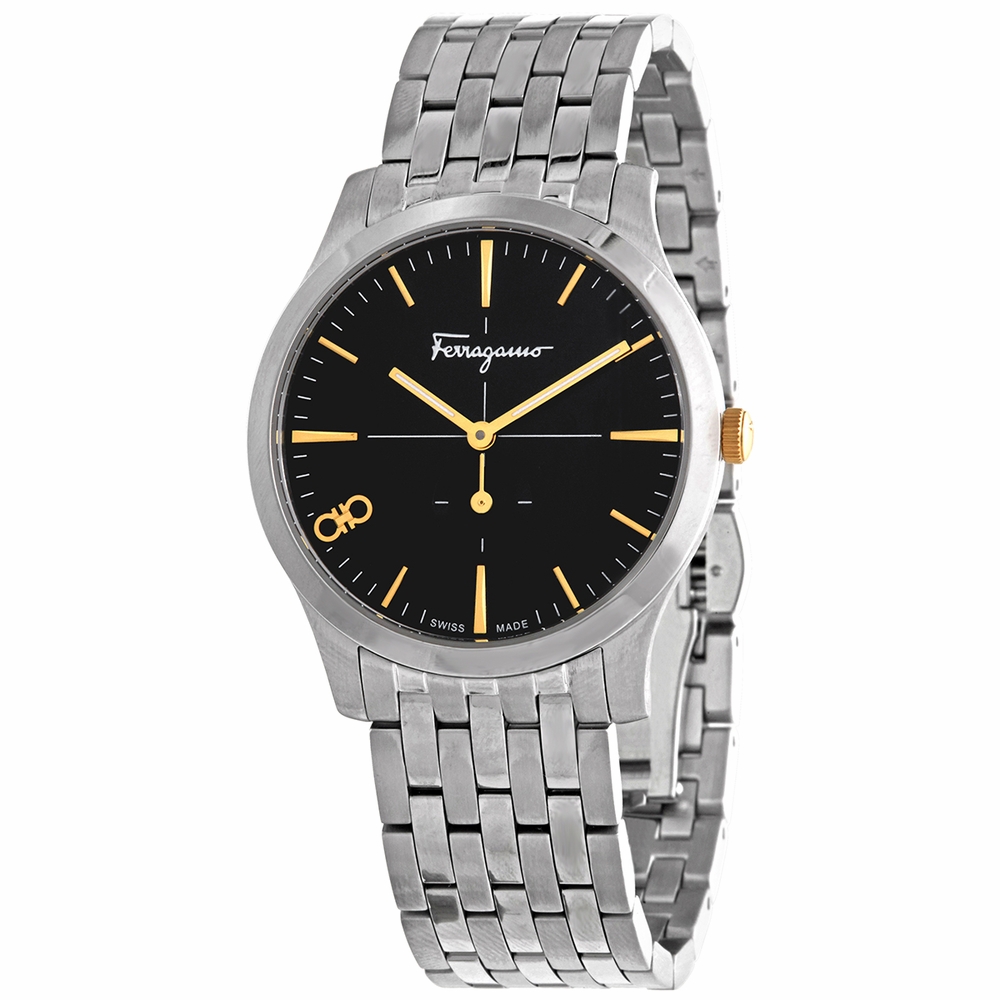 Stainless steel case with a stainless steel bracelet. Fixed stainless steel bezel. Black dial with luminous silver-tone hands and index hour markers. Minute markers around the outer rim. The Double Gancini logo appears at the 12 o'clock position. Dial Type: Analog. Luminescent hands. Small seconds sub-dial. Quartz movement. Scratch resistant sapphire crystal. Pull / push crown. Solid case back. Round case shape. Case size: 35 mm. Case thickness: 6.9 mm. Butterfly clasp. Water resistant at 30 meters / 100 feet. Functions: hour, minute, second. Slim Series. Casual watch style. Watch label: Swiss Made. Ferragamo Slim Quartz Black Dial Ladies Watch SFDF01019.