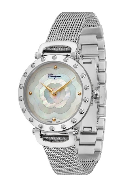 Stainless steel case with a stainless steel mesh bracelet. Fixed stainless steel bezel set with diamonds. Mother of pearl (flower pattern) dial with gold-tone hands. Dots appear at the 3, 6, 9 and 12 o'clock positions. Dial Type: Analog. Quartz movement. Scratch resistant sapphire crystal. Pull / push crown. Solid case back. Round case shape. Case size: 34 mm. Case thickness: 8 mm. Band width: 16 mm. Fold over clasp with a push button release. Water resistant at 50 meters / 165 feet. Functions: hour, minute. Style Series. Dress watch style. Watch label: Swiss Made. Ferragamo Style Mother of Pearl Flower Pattern Dial Ladies Watch SFDM00518.